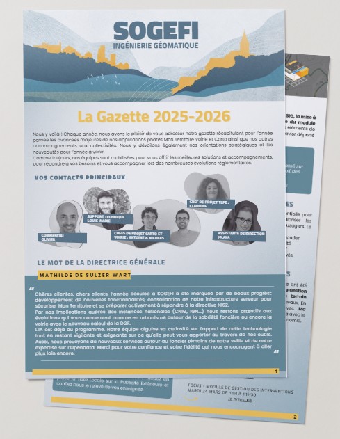 Nous y voilà ! Chaque année, nous avons le plaisir de vous adresser notre gazette récapitulant pour l’année passée les avancées majeures de nos applications phares Mon Territoire Voirie et Carto ainsi que nos autres accompagnements aux collectivités. Nous y dévoilons également nos orientations stratégiques et les nouveautés pour l’année à venir.