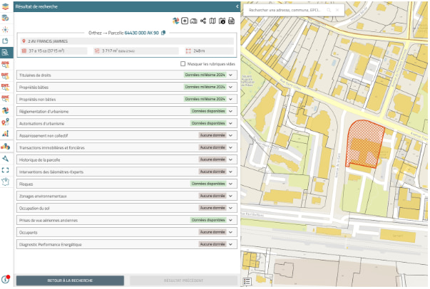 Visualisez instantanément sur une carte l’ensemble des données utilses à vos projets d’acquisitions : cadastre, DVF, documents d’urbanisme, servitudes, propriétaires (issus de vos fichiers MAJIC 3), risques… Les données du SIG sont mises à jour pour vous assurer de travailler sur une information fiable.